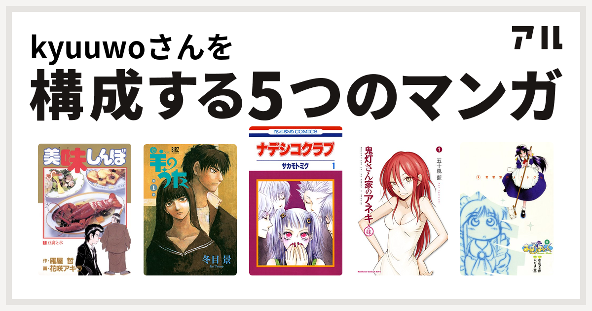 Kyuuwoさんを構成するマンガは美味しんぼ 羊のうた ナデシコクラブ 鬼灯さん家のアネキ 妹 まほろまてぃっく 私を構成する5つのマンガ アル